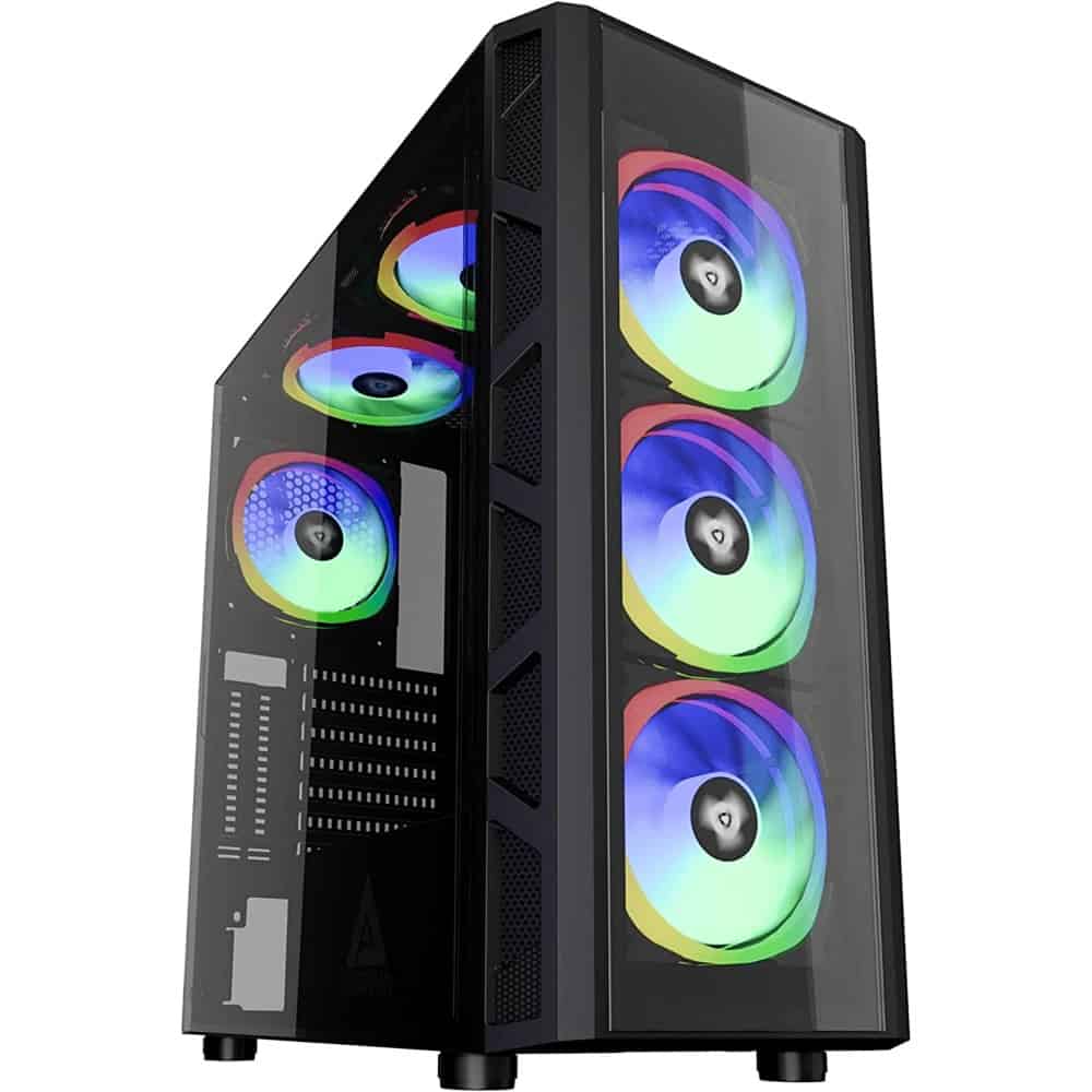 - Contemporary Solid Steel Black ATX Mid Tower Computer Gaming Case with 2x Tempered Glass Windows (Left/Front) & 6x Dual Ring RGB Fans