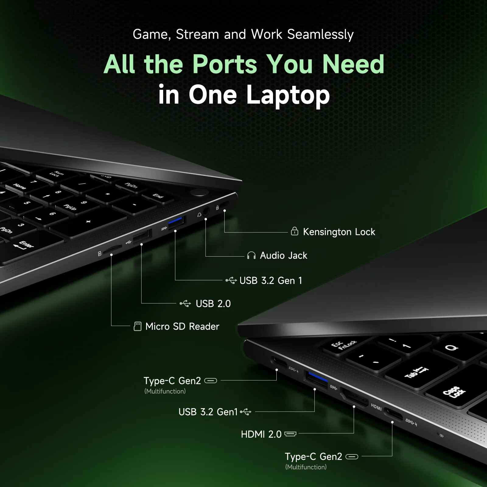 - HDMI 2.0 Port x1, USB 2.0 x1, USB 3.2 Gen1 Type-A x2, Full-Function USB Type-C 3.2 Gen 2 x2, MicroSD, Audio Jack & More